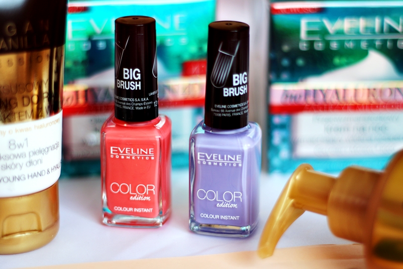 Lakiery do paznokci – pierwszy raz spotkałam się z lakierami do paznokci Eveline, do tej pory używałam wibo bądź kobo. Wyróżnia je dosyć gruby pędzelek, który idealnie pokrywa płytkę paznokcia. Kolor jest na tyle kryjący, że dwie warty tworzą idealnie pomalowane paznokcie.