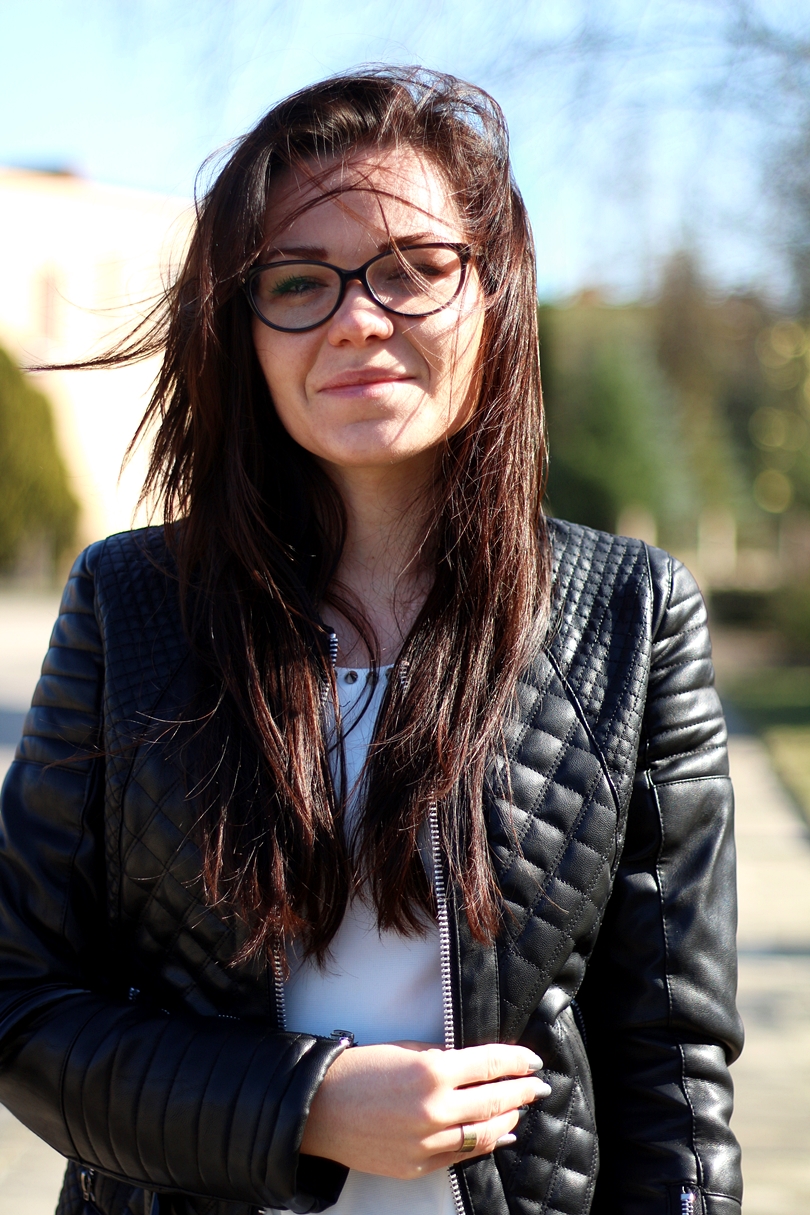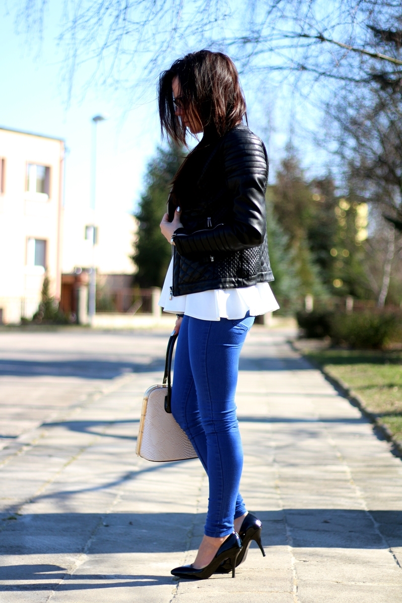 Mam wrażenie, że o wiele lepiej kształtują sylwetkę i dodatkowo wydłużają nogi. Przy moim wzroście jest to co najmniej wskazane. Dzisiaj prezentuje dosyć klasyczne zestaw, w którym jeansowe spodnie połączyłam z białą baskinką z ćwiekami na rękawkach i skórzaną pikowana ramoneską. Aby całość była utrzymana w klasycznym wydaniu dobrałam do tego zestawu czarne, lakierowane szpilki i beżową lakierowaną torebkę z czarnym spodem. W takich klasycznych zestawach czuję się najlepiej!