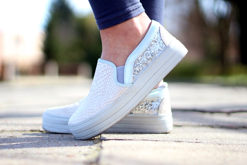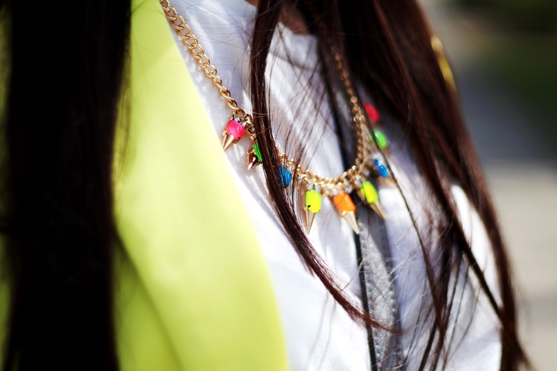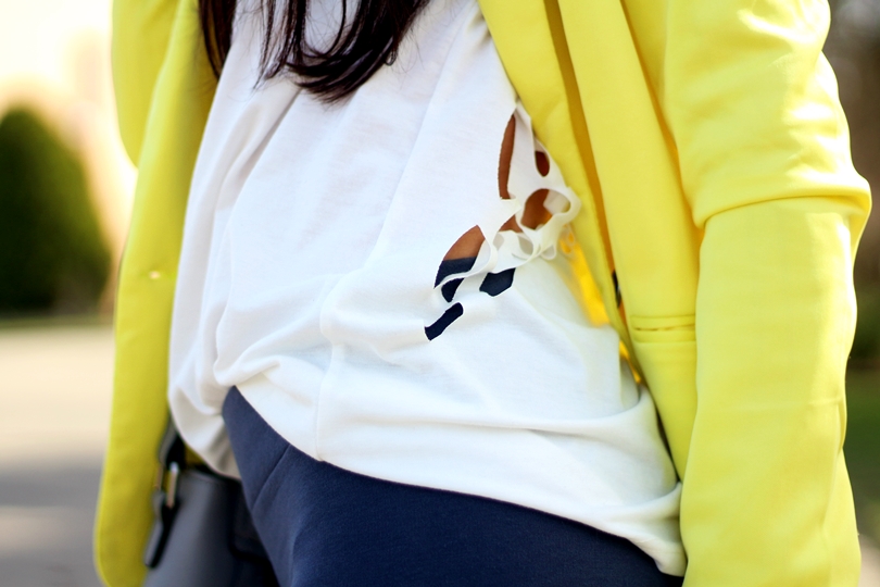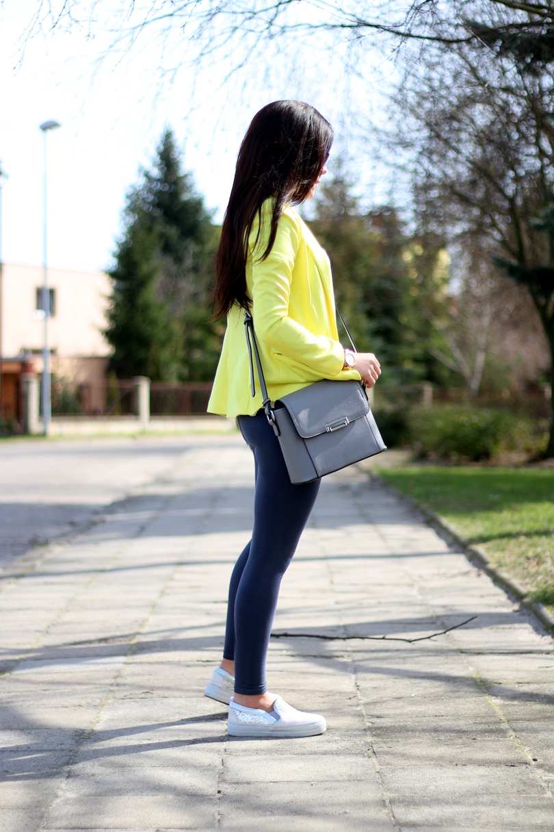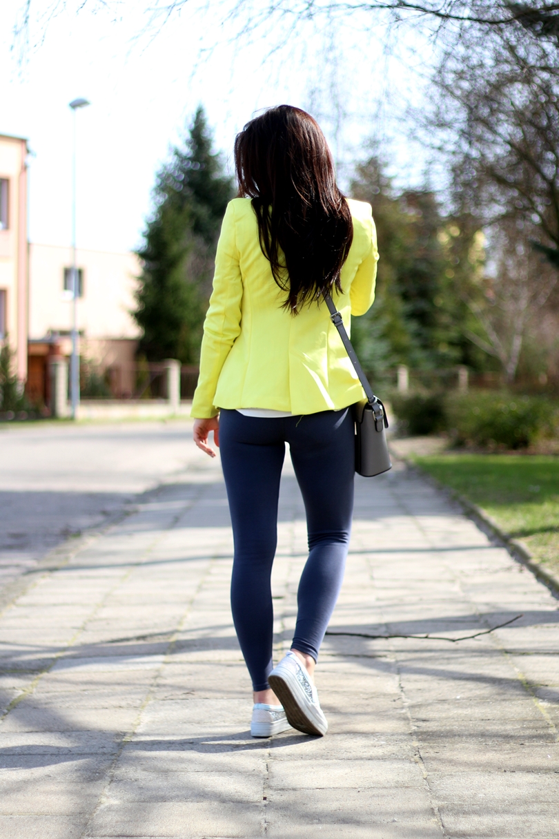 Już jakiś czas temu spodobały mi się żółte/limonkowe rzeczy. Mam kilka bluzek, w tym odcieniu no i właśnie marynarkę, która w sam raz nadaje się na wiosenne dni. A więc żółtą marynarkę połączyłam z białym tshirtem, którego wyróżniają wycięte na plecach skrzydła. Akurat ten set mimo marynarki jest raczej sportowy. Bowiem na nogach mam wężowe trampki z cekinowymi dodatkami. W tym zestawie całkowicie zrezygnowałam z kolory czarnego, tak więc i torebka pojawiła się szara.