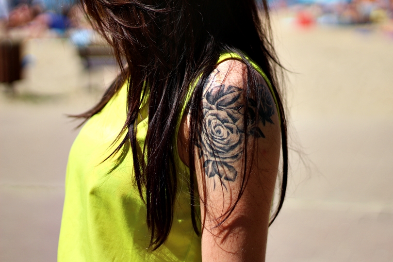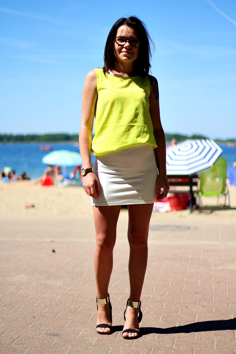 Limonkowo neonową bluzkę połączyłam z dopasowaną białą spódnicą i czarnymi sandałkami z silikonowym paskiem przy kostce w kolorze złotym. Podczas upalnych dni stawiam na wygodne obuwie a te właśnie sandałki do takich należą. Niewysoki słupek sprawia, że nadają się na dłuższe chodzenia, a dodatkowo ja czuje się lepiej, gdyż nie przepadam za niskimi butami, tym bardziej do spódniczki.
