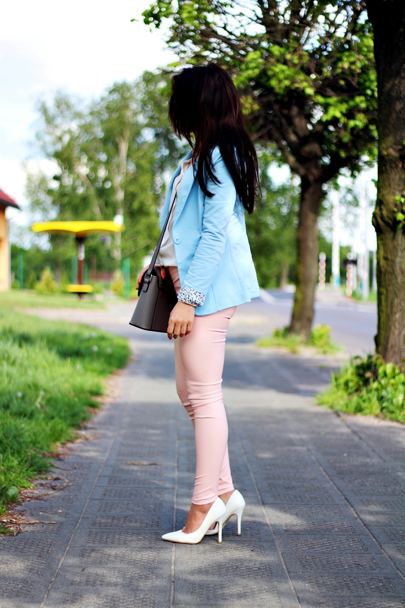 Szczególnie wiosną i latem stawiam na delikatne kolory, królują wtedy odcienie błękitu, różu, mięty, cytryny i w szczególności bieli. Dzisiejszy zestaw całkowicie odzwierciedla moje pastelowe nastawienia na kolory. Błękitną marynarkę połączyłam z pudrowymi legginsami z eko skórki, do tego biała koszula i białe asymetryczne szpilki. Delikatnie i w sam raz dla mnie. W takich zestawach czuje się świetnie i mam nadzieję, że i wam się podoba.