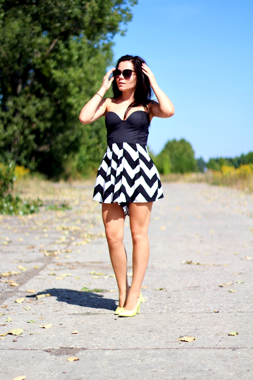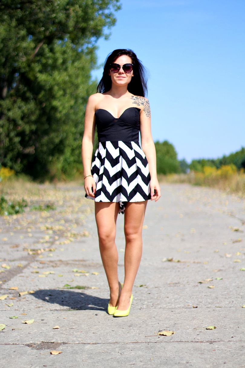 Kombinezony są bardzo leniwą formą ubioru, nie musimy się zastanawiać z czym połączyć bluzkę bądź jakie wybrać spodni i na odwrót. Wybieramy kombinezon i zarazem mamy wybraną górę i dół naszej stylizacji. W dzisiejszym wpisie postawiłam na czarno biały kombinezon, któremu akcentu nadają żółte szpilki. Aby całość nie wyglądała zbyt smętnie postawiłam właśnie na tego typu buty. Zdjęcia robiłam akurat gdy na dworze temperatura przekraczała 30 stopni więc ciężko było spojrzeć bez jakichkolwiek okularów przeciwsłonecznych. Wybrałam moje duże muchy, kupiłam je na krótko przed wylotem do Grecji. Teraz już tylko pozostaje nam schować letnie rzeczy głęboko do szafy a na wierzch wyciągnąć swetry i spodnie. Nie ma co, lato dopisało szczególnie druga połowa wakacji.