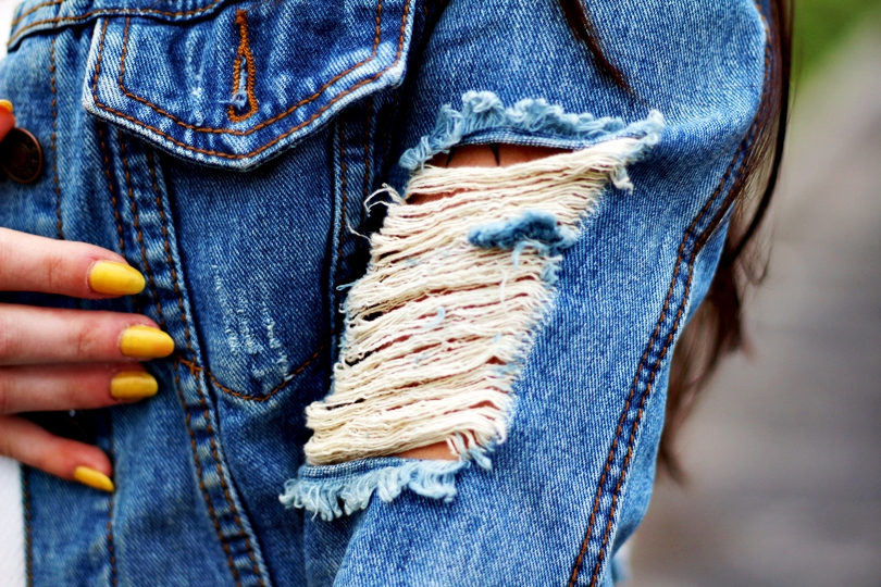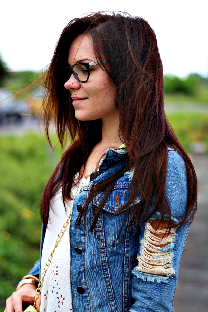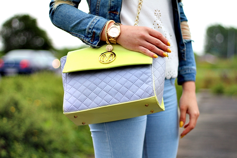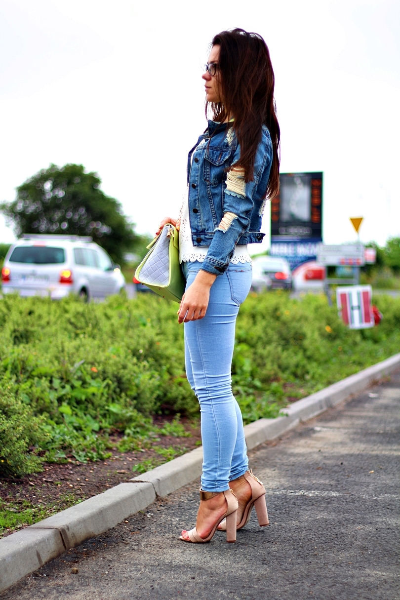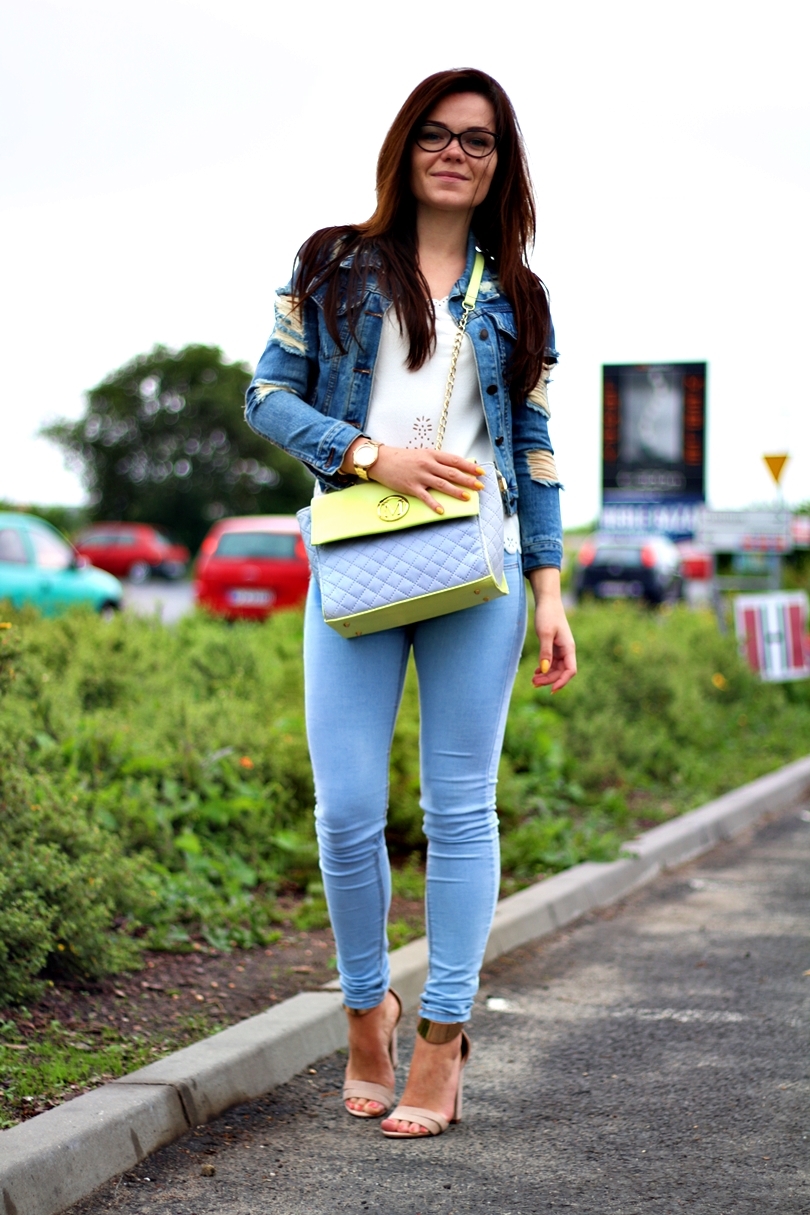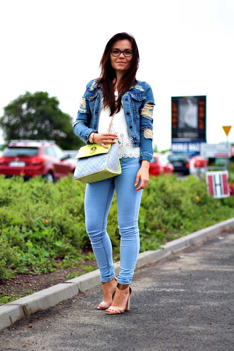 Jednak stwierdziłam, że pogoda nie wyglądała na wyjątkowo letnią dlatego postanowiłam opublikować wpis w okolicach jesieni. Jeansowe rzeczy kojarzą mi się z jesienią i już chłodniejszymi dniami. Katankę z przetarciami połączyłam z jasnymi, dopasowanymi spodniami i beżowymi sandałki. Pastelowa torebka jako letni akcent, zapewne gdybym tworzyła tę stylizację teraz, zamieniła bym ją na brązową bądź beżową. Kilka dni temu wybrałam się na jesienne zakupy, jednak nie wpadło mi nic ciekawego w oko, kupiłam 4 pary spodni, koronkową baskinkę, beżowy sweterek i krótką kurteczkę z frędzelkami z bershki. Brakuje mi jeszcze zimowego płaszcza, ale wypatrzyłam już sobie ładny, beżowy w h&m.