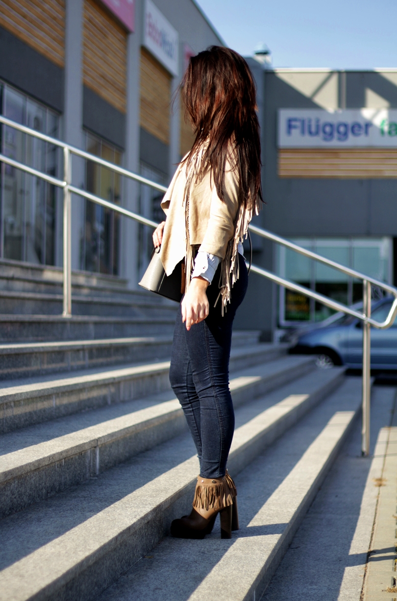Wydaje mi się, że cała moda i bum na frędzle to taki chwilowy trend, jednak nie wiem czy to prawda, dlatego sama chciałam się przekonać jak się czuję w frędzlach. , dodatkowo skusiłam się na botki z doczepianymi „dzyndzelkami” jak to nazywa mój Mikołaj, które znajdziecie w nowościach sklepu pantofelek24. Beżowy kolor katanki przełamałam ciemnymi, jeansowymi spodniami z wysokim stanem i jeansową koszulą. Jako dodatek dobrałam delikatny, złoty zegarek lorus. Zapewne zauważyliście, że zegarki tej firmy dosłownie uwielbiam i to już mój kolejny nabytek, także w kolorze złotym. Zdjęcia powstały przy okazji gdy szliśmy na spotkanie z projektantem w sprawie kuchni. Białe, stylowe meble z ciemnym blatem już niedługo pojawią się w naszej kuchni ♥