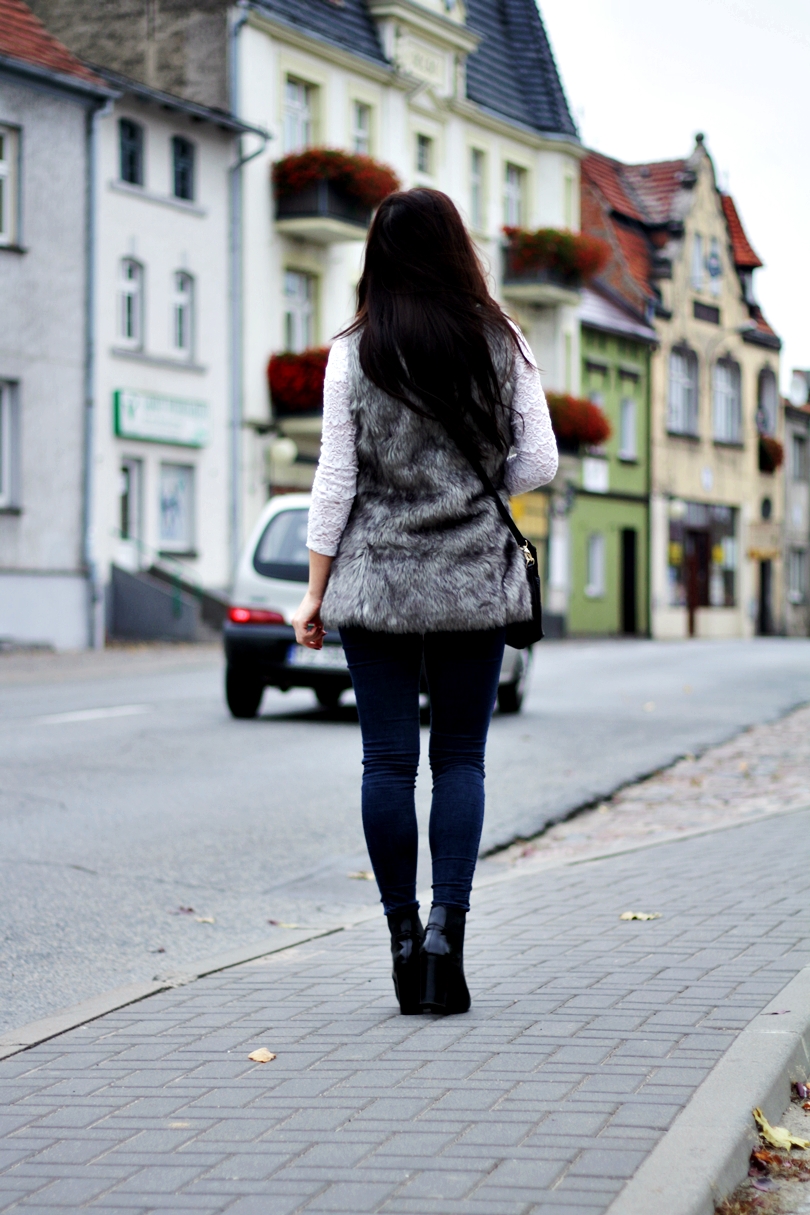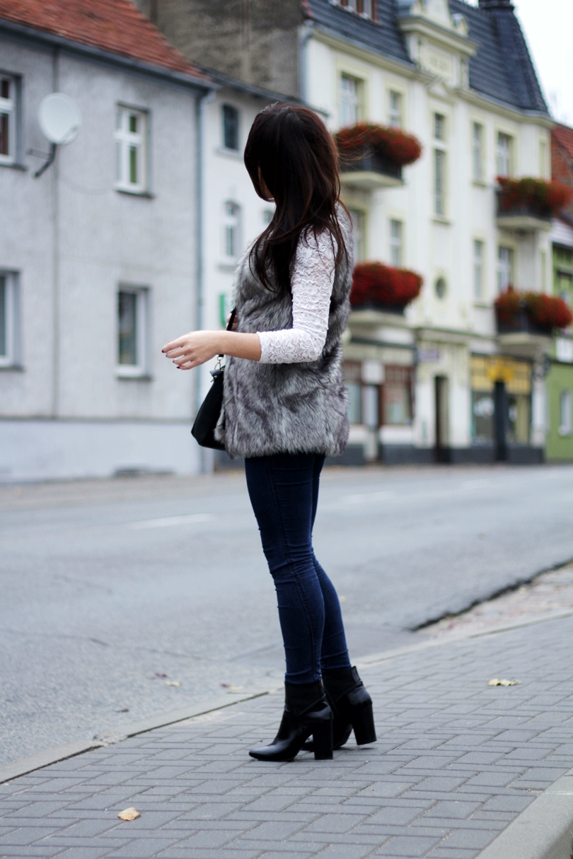 Mam na sobie bluzkę baskinkę koronkową z hm, dopasowane jeansy, kamizelkę futerkową i lakierowane botki.