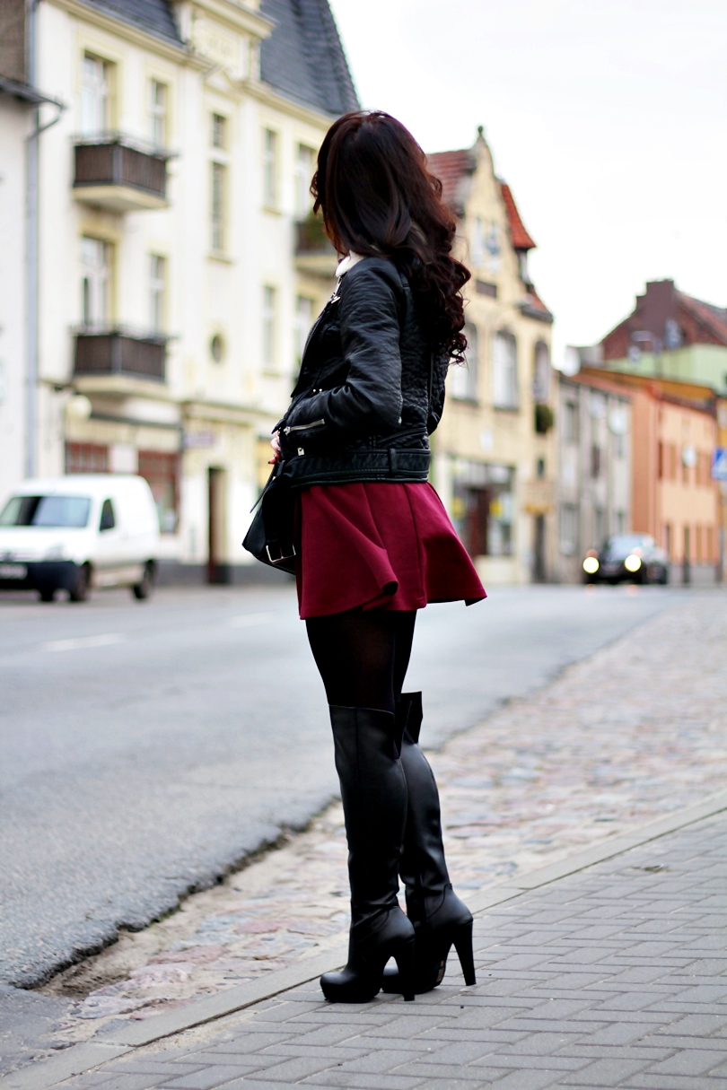 dlatego w weekend lubię gdy są one rozpuszczone. Dla niewielkiego urozmaicenia wyglądu końcówki włosów pokręciłam lokówką stożkową. Ostatnio z dna szafy wyciągnęłam bordową spódnicę, do której założyłam kozaki za kolano ze sklepu stukstuk.pl. To moje pierwsze kozaki, których cholewka sięga powyżej kolana, klasyczne, czarne, wykonane ze skóry naturalnej takie idealne na tegoroczną zimę. Aby nie dodawać więcej kolorów tworząc ten zestaw postawiłam na czarną kurtkę w stylu biker i czarne, kryjące rajstopy. Dodatki w kolorze złotym, zegarek i delikatna bransoletka z lulilaj. Biżuteria tego typu zauroczyła mnie na tyle, że jeszcze nie raz pojawi się jako dodatek do moich zestawów.