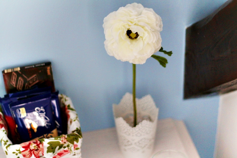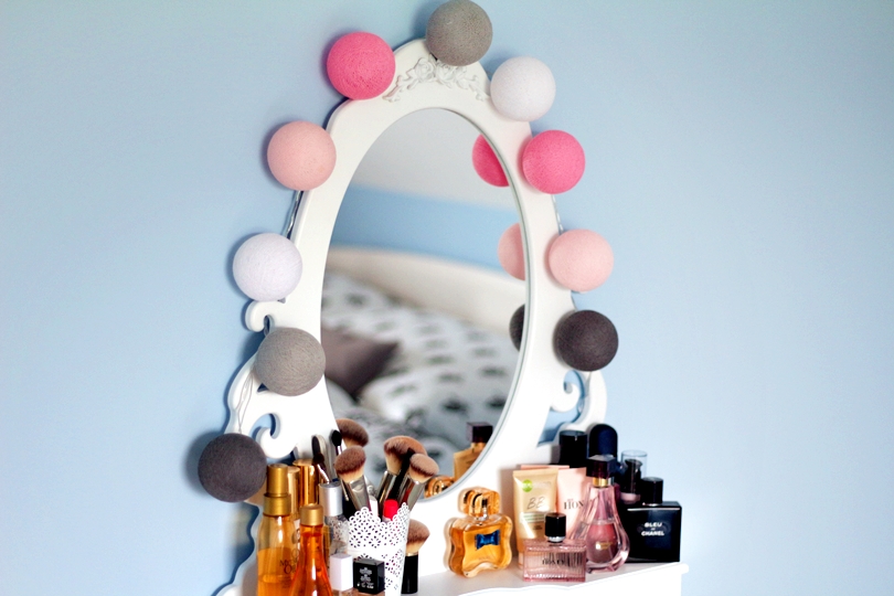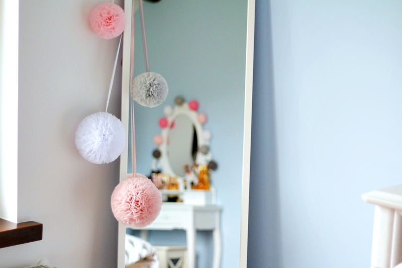 Wow your room is absolutely lovely! Love how feminine it is and the color blue on the walls. Also such a fan of those paper pastel pompoms on your mirror!