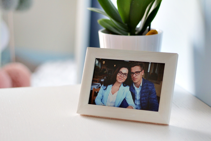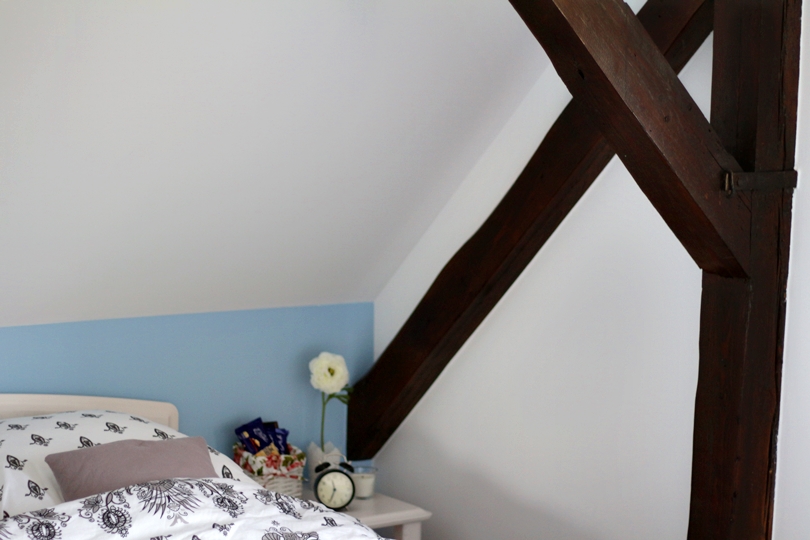 Sypialnię urządziliśmy w lekki, ciepłym stylu. Błękitno białe ściany, na którym znajdują się ciężkie toporne belki stropowe, białe meble i białe dodatki. W naszej sypialni znajduje się łóżko, komoda, lustro i mój kącik czyli romantyczna, biała toaletka upolowana w impresje24.pl . Jeżeli szukacie ciekawych i oryginalnych dodatków oraz mebli do waszego wnętrza to szczerze z czystym sumieniem polecam wam ten sklep. Wokół naszego łóżka znajdują się dwie małe szafeczki nocne. Po mojej stronie jest czarny budzik i kosz słodyczy, u Mikołaja natomiast jest lampka nocna z BRW. Oboje stwierdziliśmy, że jedna w zupełności nam wystarczy. Biała pościel, dodatki w formie szarych bryłowych świec i pompony, mnóstwo pomponów tiulowych. Te cudaśne zdobienia znajdziecie na Emamo.pl . Jeżeli chodzi o moje centrum dowodzenia a zarazem miejsce, w którym codziennie rano doprowadzam się do stanu normalności to niestety się na nim nie mieszczę, dlatego bok stoi biały kosz z pozostałymi kosmetykami. Na blacie toaletki Mikołaj postarał się o szybę, aby wszelkiego rodzaju kosmetyki nie zaszkodziły tej białej piękności. Z naszej sypialni prowadzą drzwi, za którymi jest garderoba. Wąska znajdująca się pod skosem. Ciemne podłogi zdobią białe listwy przypodłogowe, których akurat nie widać dlatego że na jednej ścianie jeszcze ich brakuje. Wszystko w rękach stolarza. Delikatne kolory sprawiają, że codziennie rano budzę się wypoczęta i pełna energii na jeszcze więcej wrażeń. Nasze mieszkanie jest już prawie na finiszu. Salon jest już urządzony a my złożyliśmy już połowę mebli do kuchni.