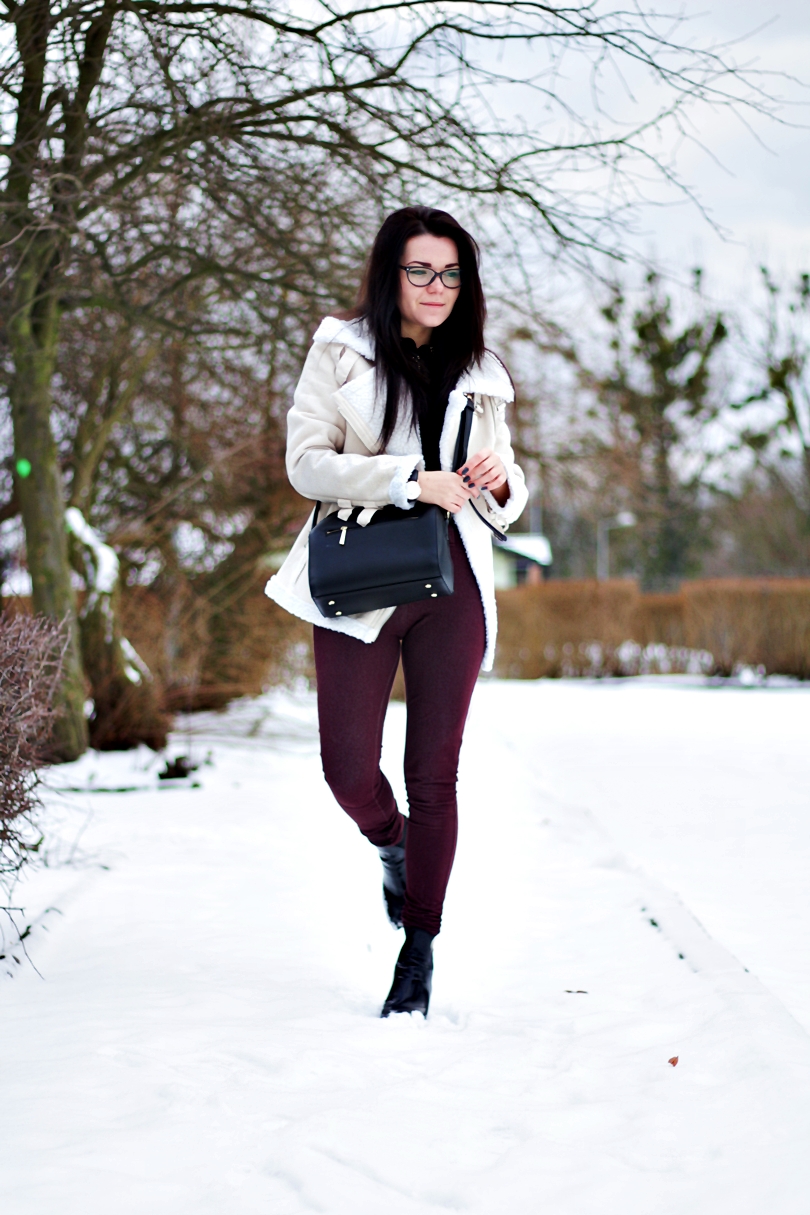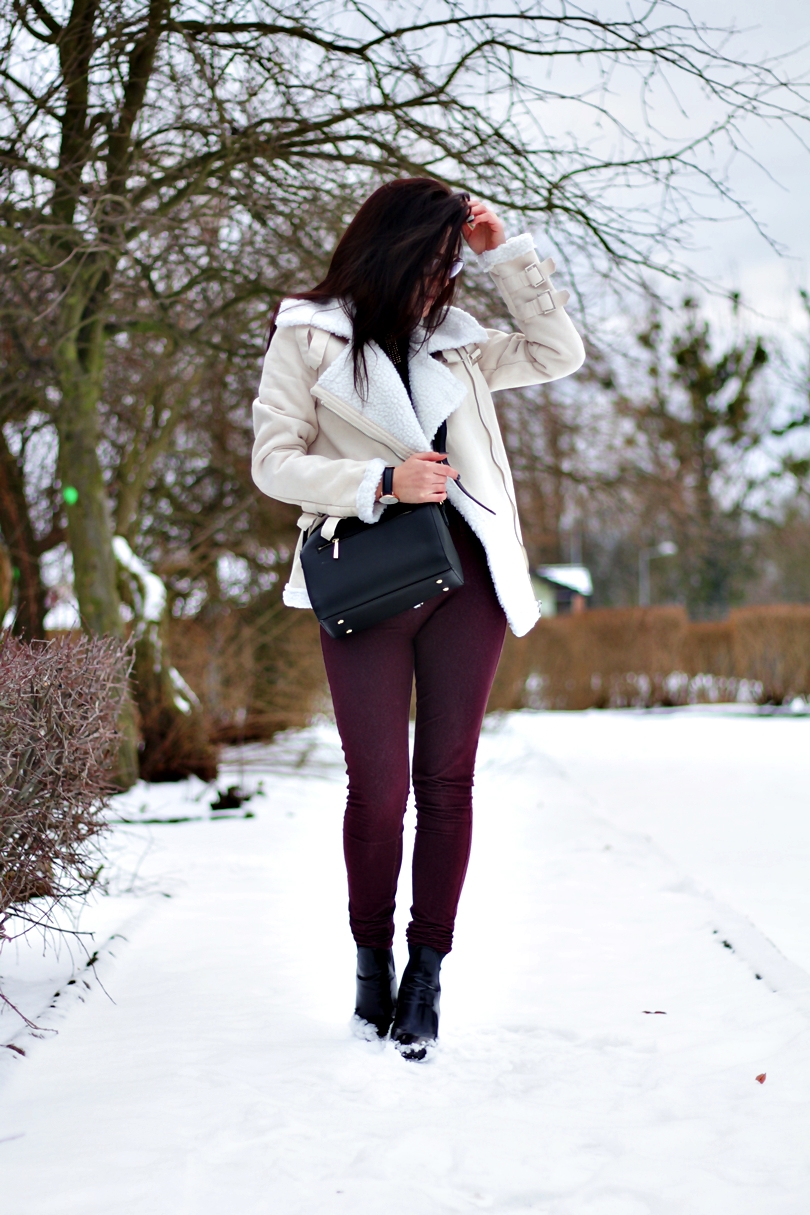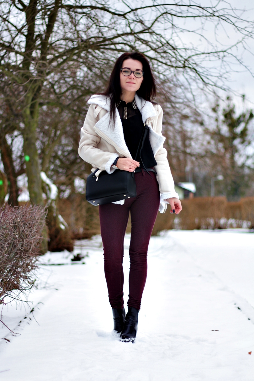 Staram się wtedy nie kupować ze dużo nowości, przecież większość rzeczy nosimy zakrytych kurtką bądź płaszczem. Gdy więc odzieżą wierzchnią jest dla nas non stop ta sama kurtka na przemian z płaszczem wolę wtedy postawić na jakieś ciekawe spodnie czy spódniczkę. Dzisiaj mam dla was spodnie, czy może lepiej legginsy z bonprix bo od spodni odróżnia je tylko brak guzika i suwaka, są na gumce jak legginsy w kolorze burgundowym. Do spodni wybrałam czarną mgiełkę z ozdobnym kołnierzykiem, czarne lakierowane botki i czarny cienki pasek, który wy haczyłam ostatnio w mohito. Kurka, a raczej kożuszek przeleżał w szafie z metką dokładnie rok. Podczas przeprowadzki sobie o nim przypomniałam i dobrze, bo ile można chodzić ciągle w jednym i tym samym płaszczu.