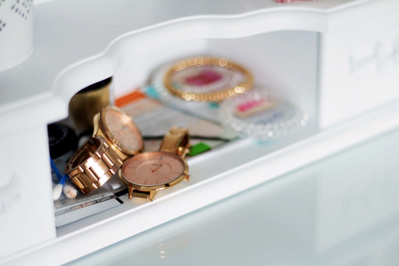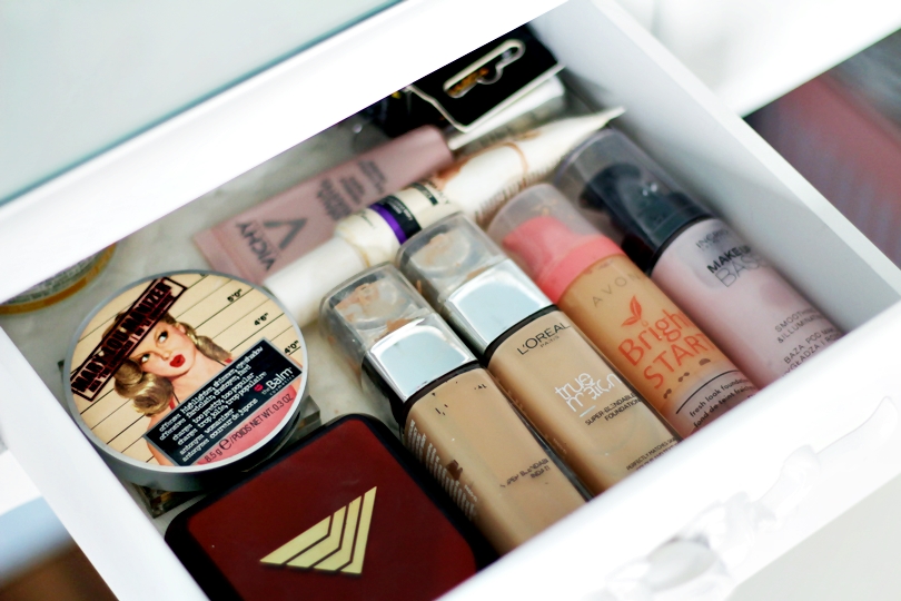 Obietnicy dotrzymał, a ja mam teraz miejsce, w którym trzymam kosmetyki i codziennie rano robię makijaż. Białą toaletkę, którą znajdziecie w impresja24 udekorowaliśmy kulami cotton ball lights, aby zadbać o piękny biały blat przed zabrudzeniem kosmetykami Mikołaj zamówił u szklarza szybę na wymiar, na której ustawiona jest nadstawka z lustrem i dwoma szufladkami. Szufladki w nadstawce wypełniłam ulubionymi pomadkami. Głownie wybieram te z bourjois i loreal. Na półce trzymam zapachy, olejki do włosów, krem BB oraz białą osłonkę z pędzelkami hakuro. Toaletka ma jeszcze dwie szufladki pod blatem, szuflada po lewej zarezerwowana jest na pudry, korektory i produkty do konturowania natomiast ta po prawej mieści kredki, eyelinery, tusze i konturówki.