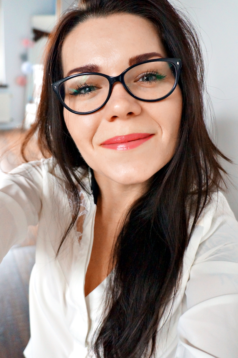 Mój codzienny makijaż składa się z nałożenia kremu BB skin79 snail, następnie jako korektora używam punktowo podkładu loreal true match obecnie używam jaśniejszy kolor N1, latem stawiam na ciemniejszy N2. Do konturowania używam bronzera ziemi egipskiej Bikor, rozświetlacza Mary Lou oraz różu Lambre nr3. Oczy maluję tuszem loreal false lash wings, używam eyelinere loreal, brwi podkreślam farbką do brwi revolution. Usta na zdjęciu pomalowałam pomadką bourjois aqua laque 01.