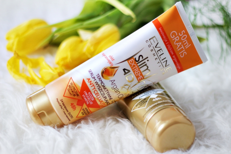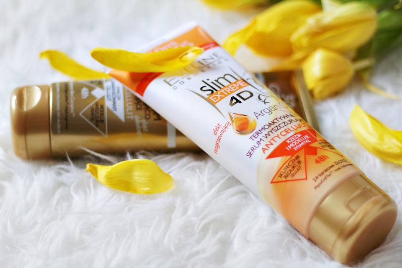 Eveliny i ich świetne serum były ze mną odkąd rozpoczęłam swoją walkę o idealne ciało. Zawsze w okresie zimowym wolałam wybrać te z efektem rozgrzewającym, natomiast chłodzące wolałam zostawić zdecydowanie na lato. Również i wśród tych balsamów odchudzających znalazłam swoje rozświetlające zwolenniki zawierające drobinki złota. Oczywiście nie była bym sobą gdybym nie zamówiła czegoś na wyrost w StrefaUrody, stąd też to Złote serum wyszczuplająco modelujące z efektem chłodzącym – przyda się latem 🙂 Teraz za to używam Termoaktywne serum wyszczuplające, które po kąpieli otula mnie ciepłym dotykiem. Z serii Eveline Slim Extreme 4D miałam już chyba wszystkie dostępne balsamy, te w dzisiejszym wpisie to całkowite nowinki dla mnie, jednak niczym nie odbiegają od swoich świetnie działających poprzedników z serii 3D czy 4D. Serum świetnie ujędrnia, napina skórę i dodatkowo pokrywa ją delikatnie mieniącymi się drobinkami złota.
