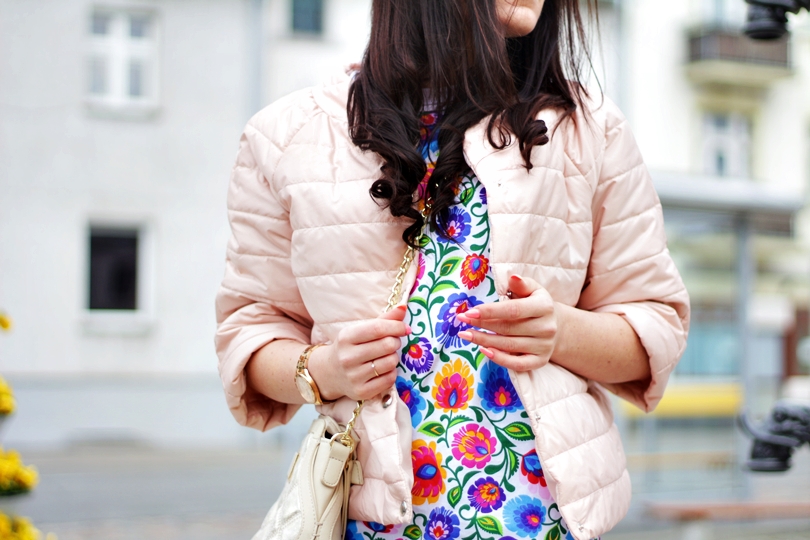Za sprawą tych nadciągających pozytywnych barw, również w mojej szafie nastała mała wiosenna rewolucja. Wybierając dzisiejszy look postawiłam na typowo słowiańską sukienkę od Moda Folkowa, do której dobrałam pudrową kurteczkę. Mimo doboru złotej torebki z mojego ulubionego Kolorowego Sklepu, gdzie kupuje perełki monnari całość nie wyszła cukierkowo, lecz delikatnie i świeżo. Pastelowe czółenka i złoty zegarek kończą ten typowo wiosenny look. Ostatnio szaleję na punkcie torebek monnari, to już moja trzecia i na pewno nie ostatnia. Kilka dni temu, za to, że byłam taka dzielna podczas robienia tatuażu dostałam od narzeczonego piękną, lakierowaną w kolorze koralowym, już niedługo zobaczycie ją na blogu ♥