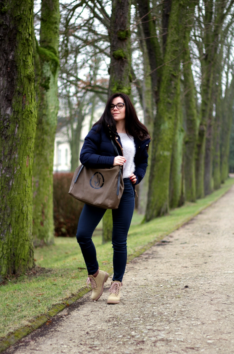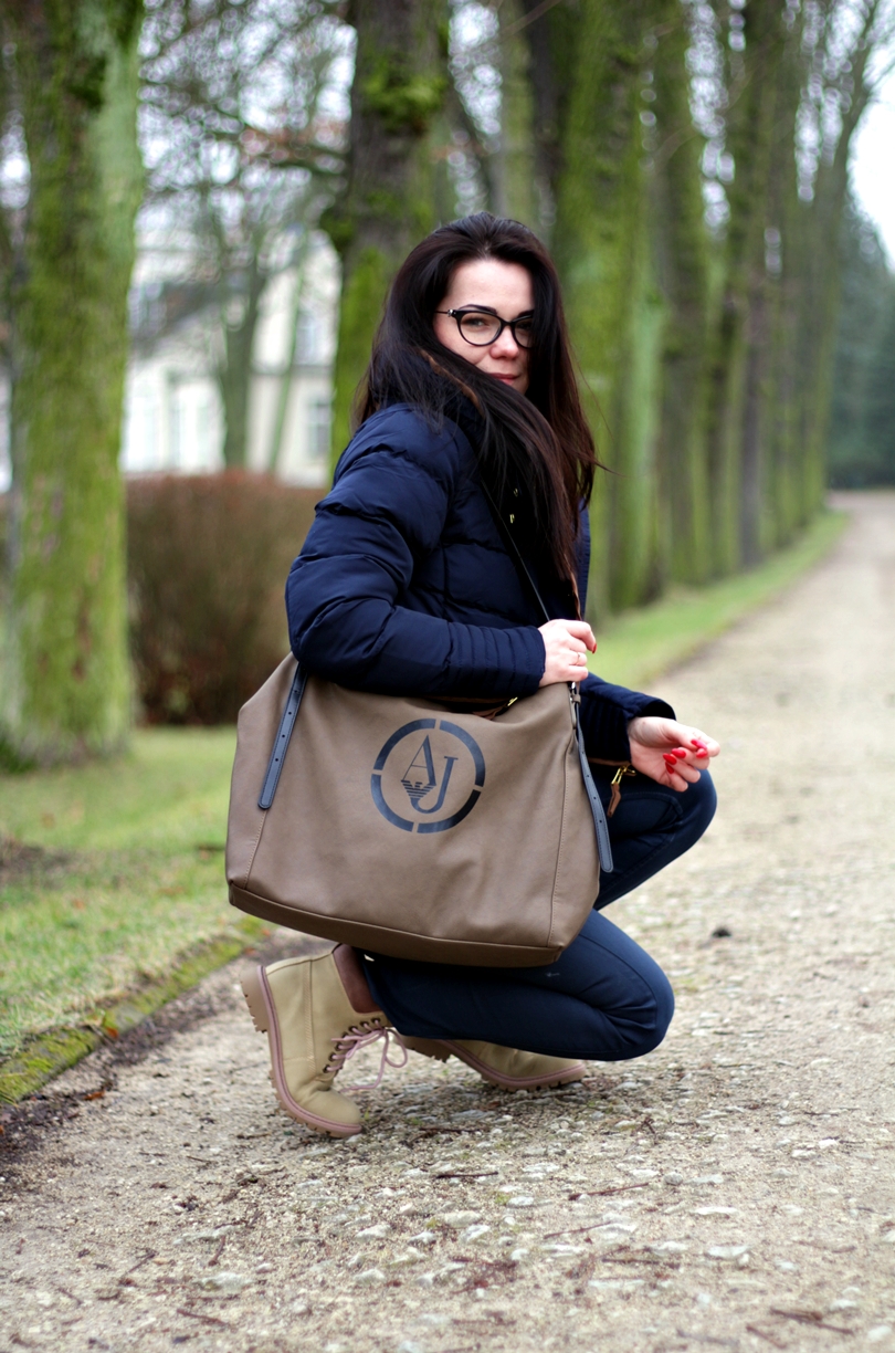 No może z raz 🙂 Tym razem przełamuję mój zimowy styl i zamiast wełnianego płaszcza tego roku nabyłam dwie ciekawe kurtki puchowe. Jedną prezentuję dzisiaj, aczkolwiek chodzi o granatową puchówkę denley, która dzięki swemu kolorowi idealnie pasuje do granatowych jeansów z wysokim stanem. To mój nowy nabytek, jeansy Lee leżą idealne, dostaniecie je w super cenie na indianoutlet. Jeżeli chodzi o dzisiejszy look to jest bardzo lifestylowo dlatego też postawiłam na wygodne trapery oraz torebkę typu worek. Mega pojemna torebka od Armaniego z clickchic pomieści aparat, zakupy, a mimo to nie sprawia wrażenia ordynarnej. Swego czasu zawsze stawiałam na listonoszki, a tu widzicie mnie nie tylko w puchówce ale również z dużą torbą, taki odmienny styl a i tak czuję się w nim super.
